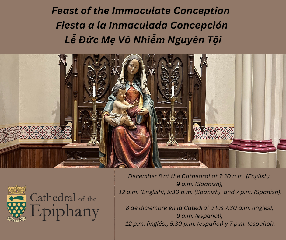 Next Monday, December 8, we will celebrate the Solemnity of the Immaculate Conception. This is a holy day of obligation, which means all Catholics are required to attend Mass. You will find our parish Mass schedule in the graphic below.