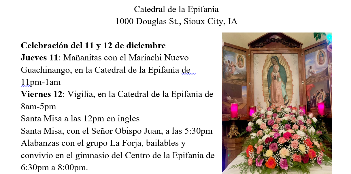 El próximo viernes celebraremos la Fiesta de Nuestra Señora de Guadalupe. Como en años anteriores, comenzaremos con el rosario a las 10:00 p.m. del 11 de diciembre, seguido de una serenata con mariachi de 11:00 p.m. a 1:00 a.m., iniciando este hermoso día en compañía de Nuestra Santísima Madre.